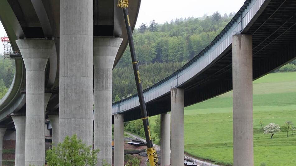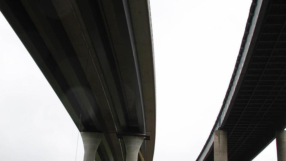 Noch stehen sie vertraut nebeneinander: Die alte und die neue Sinntalbrücke. Der Verkehr rollt bereits über die neue. Die Tage der alten Brücke sind gezählt.