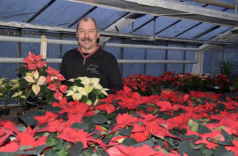 Der 55-jährige Gärtner ist Weihnachtsstern-Fachmann und zieht jedes Jahr mehrere hundert Pflanzen selbst. Rote, weiße, rosafarbene und auch gesprenkelte Exemplare in verschiedenen Größen.