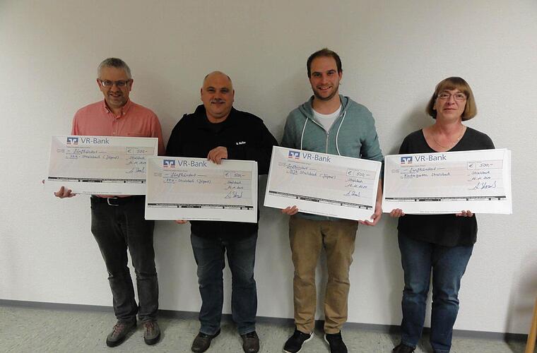 Über die großzügige Spende von jeweils 500 Euro freuten sich die Vertreter der örtlichen Vereine, Petra Straub (Kindergarten), Andreas Straub (DJK), Bernd Müller (Feuerwehr) und Harald Kässner (SKK).