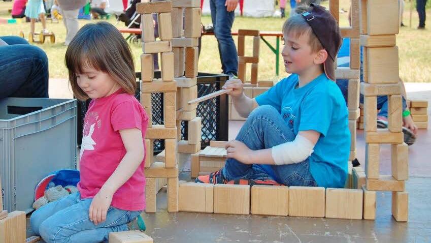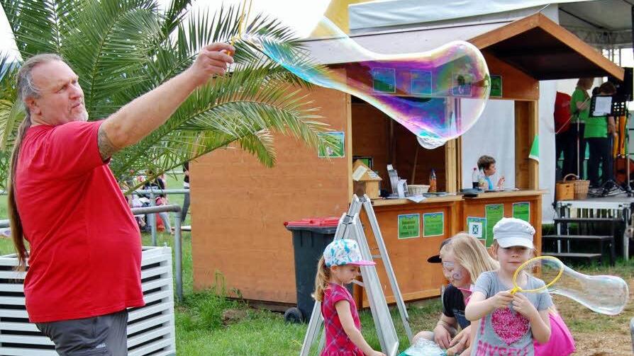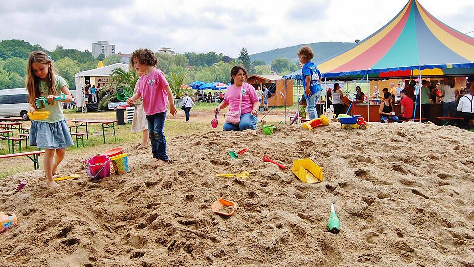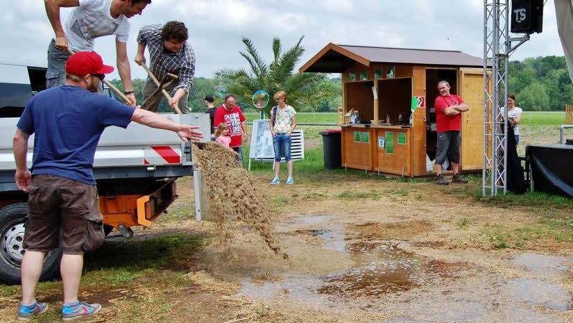 Bernd Keller mit Musik und Gesang unterstützte. Doch dann griffen starke Mannsbilder zu den Schaufeln und füllten die Pfützen vor der Bühne mit Sand vom riesigen Sandhaufen, der in der Nähe den Kleinsten eine unerschöpfliche Spielfläche bot.