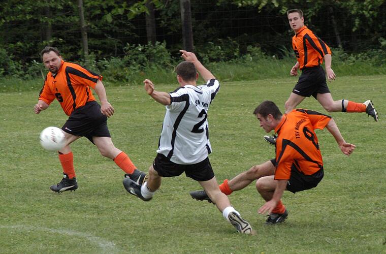 Auf Seiten der Gäste agierte in der Defensive unter anderem Andreas Brust, der sich im Bild vehement in den Schuss von Baumann wirft. "Ich würde ihn als Jürgen Kohler des TSV Volkers bezeichnen. Das sagt eigentlich alles", charakterisiert Heiko Zeier den Abwehrstrategen. "Eigentlich bin ich nur als 'Wildsau' bekannt. Man müsste den Heiko fragen, wo er das herhat", entgegnet Andreas Brust süffisant, der auch heute noch ab und an die Kickstiefel schnürt. "Bei dieser Gelegenheit möchte ich mich nochmal bei allen Mannschaften für die schönen Spiele bedanken und mich bei denjenigen entschuldigen, wo es mal etwas härter war. Ich hoffe, dass es auch in Zukunft weitergeht", sagt der 36-Jährige.