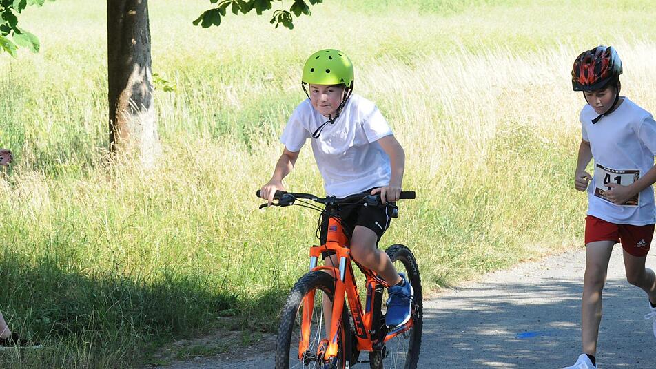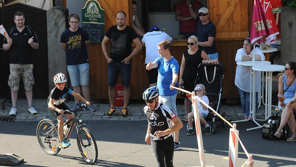 Wer da war, hatte seinen Spaß an diesem besonderen Wettkampf-Format. Beim Nüdlinger "Bike & Run" treten jeweils Zweier-Teams an, die die ausgeschilderten Strecken über vier oder acht Kilometer gemeinsam bewältigen, sich dabei jederzeit beim Laufen und Radfahren abwechseln können. "Leider traten von ursprünglich zwölf gemeldeten Teams nur sechs an. Die Hitze sowie Konkurrenzveranstaltungen wie der gleichzeitig stattfindende Rhön-Grabfeld-Cup in Saal haben bedauerlicherweise einen erhofften höheren Zuspruch vereitelt", bilanzierte Organisator Wolfgang Wilm etwas enttäuscht. Dies tat der Stimmung aber keinen Abbruch, die Sportler gingen die Aufgabe ehrgeizig und mit vollem Einsatz an. Zeitnehmer Patrick Kirchner durfte als erstes Team im Ziel Lucas und Marius Deininger begrüßen, die die kürzere Runde ohne Konkurrenz in 19 Minuten und 54 Sekunden bewältigten.