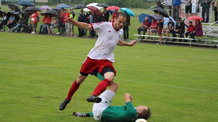 Der gerade verwarnte Manuel Schuhmann mähte an der Außenlinie den starken Daniel Kraus um, was den souveränen Referee Frank Staudinger (Obernau) sofort die Ampelkarte zücken ließ. Die Partie verlief in den nächsten 20 Minuten ohne größere Höhepunkte vor den Toren. Dass die Platzherren nicht an einen Umschwung dachten, bewies die Herausnahme von Christoph Dorn zwecks Schonung für das Hettstadt-Match. In der 77. Minute hätte der bisherige Kreisklassist den Sack endlich zumachen können: Nach einem schnellen Konter über mehrere Stationen setzte Kraus das Leder dann doch über die Latte. Eine Minute später brach Kraus nach einem Fehlpass von Maximilian Spahn durch, seine Hereingabe auf den mitgelaufenen Kaufmann pflückte Florian Dorn gerade noch weg.