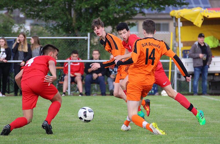 Schondra gelockt. Besonders beim Aufeinandertreffen der U17-Junioren der JFG Sinntal-Schondratal mit den Altersgenossen der Würzburger Kickers säumten mehrere hundert Zuschauer den Spielfeldrand, um das Einlagespiel der spielstarken Rothosen zu verfolgen. Die Mainstädter beeindruckten zwar mit genialer Raumaufteilung, einstudierten Laufwegen und scharf geschossenen Präzisionspässen, hatten aber offensichtlich nicht mit ganz so viel Gegenwehr der leidenschaftlich kämpfenden Rhöner gerechnet. Am Ende setzten sich die Rothosen doch noch mit 3:2 durch. "Das war fraglos einer der vielen Höhepunkte im Turnierverlauf", sagte Schondras Jugendleiter Thomas Schmitt.