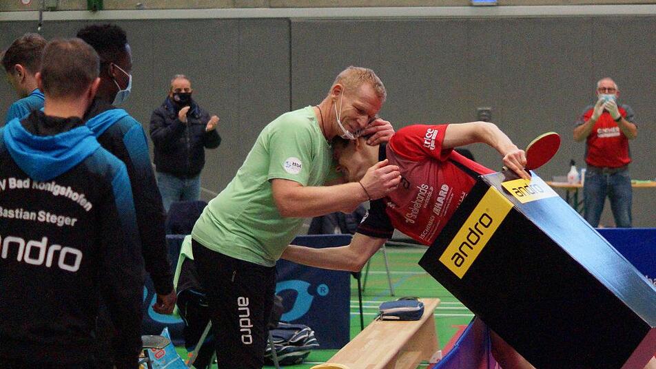 Beim TSV Bad Königshofen musste er nicht anheuern, da war er sehr willkommen. Im Vergleich zu den meisten Konkurrenten der Bundesliga, die fünf, sechs oder noch mehr lizenzierte Profis im Kader haben, besteht jener des TSV aus vier. Dies bei einer Regel-Mannschaftsstärke von drei Spielern plus Ersatzmann bzw. das Doppel. Wenn sich einer von ihnen verletzt, entspricht das zum Vergleich in einem Fußball-Bundesligakader sechs, bei zwei Verletzten zwölf Akteure. Kilian Ort ist schon längere Zeit ein Kandidat. Vor dem letzten Heimspiel fiel auch noch Bastian Steger aus. Abdel Salifou fehlte wegen Corona. Die Saison war bisher eine personelle Gratwanderung - genug Arbeit für Peter Hofmann. Salifou sollte die Folgen überstanden haben. Er war der Matchwinner gegen Grünwettersbach. "Kilian haben wir, denke ich, im Griff", befindet Hofmann. "Bei Bastian Steger wird es die Zeit zeigen. Bis zum nächsten Spiel in Mühlhausen am 22. November ist er hoffentlich wieder fit."