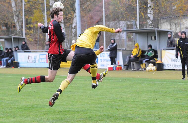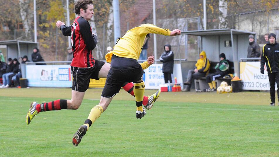 Eine glückliche Gelbe Karte "Da steckt viel Arbeit dahinter, die Jungs ziehen im Training aber auch entsprechend mit", wertschätzt Marc Hartmann die hohe Laufbereitschaft seiner Truppe, die in Ballnähe immer wieder Überzahl schuf, dem Gegner kaum Räume zum Kombinieren gab. Thulba hatte die ersten guten Aktionen durch Philipp Hölzer und Tobias Huppmann, und dennoch war die Führung der Gäste durch den direkt verwandelten Freistoßball aus 18 Metern von Lukas Nöth keinesfalls unverdient. Beim Foulspiel davor hatte Sebastian Vancea nur Gelb gesehen. Glück für den Abwehrmann, weil Nöth frei vor Torsteher Daniel Neder gewesen wäre.
