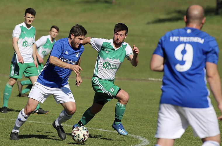 Nach fünf teils recht ernüchternden Spielen ohne Sieg wollte der SV Riedenberg gegen den FC Westheim endlich wieder ein Erfolgserlebnis in heimischen Gefilden feiern. Doch die "Waster" benötigen zur endgültigen Sicherung des Klassenverbleibs jeden einzelnen Punkt und reisten entsprechend hochmotiviert und sehr kämpferisch eingestellt in die Rhön, zumal im Hinspiel gegen die Grün-Weißen nur ein einziger Treffer den Unterschied zugunsten der Riedenberger ausgemacht hatte. Mit einem Traumtor durch Kilian Markart starteten die Gastgeber in die Partie. Der Mittelfeldantreiber hämmerte das Leder von der Strafraumkante aus per Direktabnahme flach ins lange Eck, Westheims Keeper Leon Wahler streckte sich vergeblich nach dem Diagonalball. Schon kurz zuvor hatten die Riedenberger den Torschrei auf den Lippen gehabt, doch Lukas Hergenröther scheiterte aus Nahdistanz, als er freistehend den Ball einem Westheimer Verteidiger ans Standbein drosch. Torhüter Wahler war da schon geschlagen gewesen. Mit den am Ostersamstag extrem stürmischen Verhältnissen in der Rhön kamen die "Waster" überhaupt nicht zurecht. Die langen Abschläge aus der Abwehr heraus verfehlten zumeist ihr Ziel recht knapp oder segelten weit über die Seitenlinie hinaus. Nach der Pause blieben die Grün-Weißen tonangebend. Die besten Chancen hatte der unermüdliche Philipp Dorn auf dem Fuß, der einmal im Strafraum nur die Schuhspitze an den Ball und damit zu wenig Druck aufs Spielgerät brachte und später aus zwanzig Metern etwas zu hoch zielte. Mit einer sensationellen Parade lenkte FC-Keeper Leon Wahler einen Gewaltschuss von Paul Konopka gerade noch um den Außenpfosten. Und dann schlug der Ball doch noch einmal im Westheimer Gehäuse ein: Kilian Markart sorgte mit einem Freistoß, den Leon Wahler nur noch mit den Fingerspitzen erwischte, für den verdienten 2:0-Endstand.bit