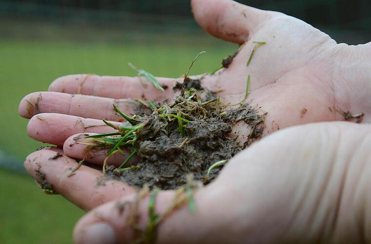 Hier in der Region verwenden wir eine sogenannte Standardmischung, die wir extern beziehen. Für besonders beanspruchte Rasenplätze, zum Beispiel in den Alpen, gibt es dann wieder robustere Gras-Sorten.