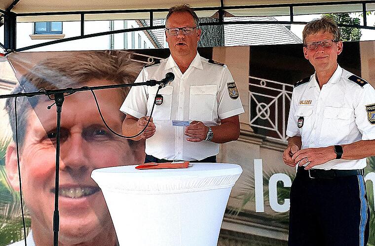 Hinter dem Rednerpult zog ein Banner mit der Aufschrift "Ick mach'n Abjang" die Blicke auf sich. Zur Versetzung von Polizeioberrat Stefan Haschke, der die Polizeiinspektion Bad Kissingen seit 14 Jahren leitet und zur Amtseinführung seines Nachfolgers, dem Ersten Polizeihauptkommissar Christian Pörtner, waren über 100 Gäste aus dem ganzen Landkreis und darüber hinaus in den Hof der Polizeiinspektion in der Kasernenstraße gekommen. Der Wechsel wird offiziell zum 1. Juli wirksam.