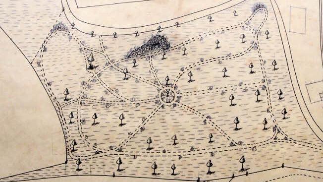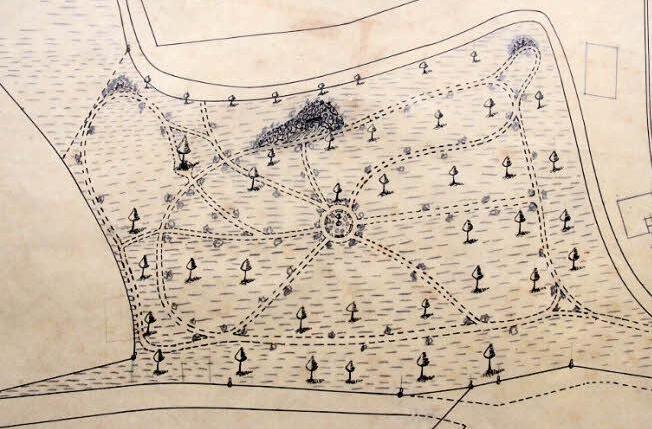 Auf der Karte sind Wege und Gestaltungselemente eingezeichnet.