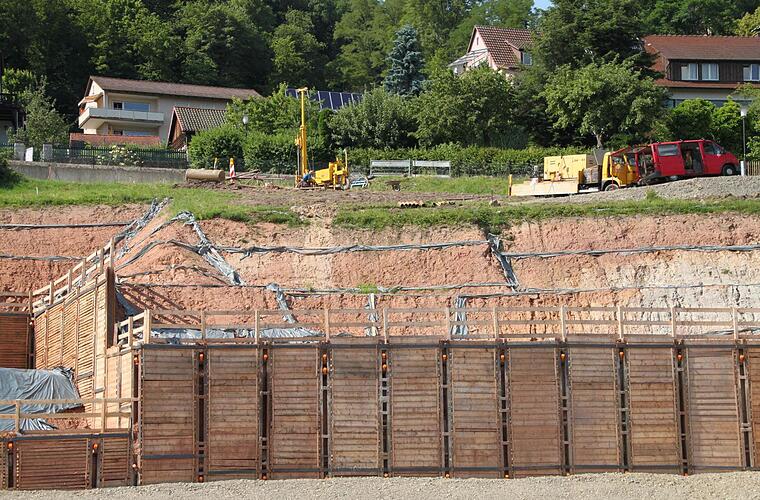 Im Frühling dieses Jahres war der Hang oberhalb der Großbaustelle in Bewegung geraten. Anwohner schlugen Alarm, weil sich Risse in ihren Häusern bildeten. Im Juni sperrte die Stadt die Hartstraße, die unmittelbar am Hang entlang führt, für den Lkw-Verkehr.