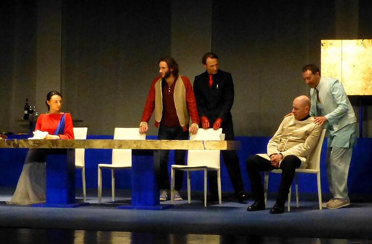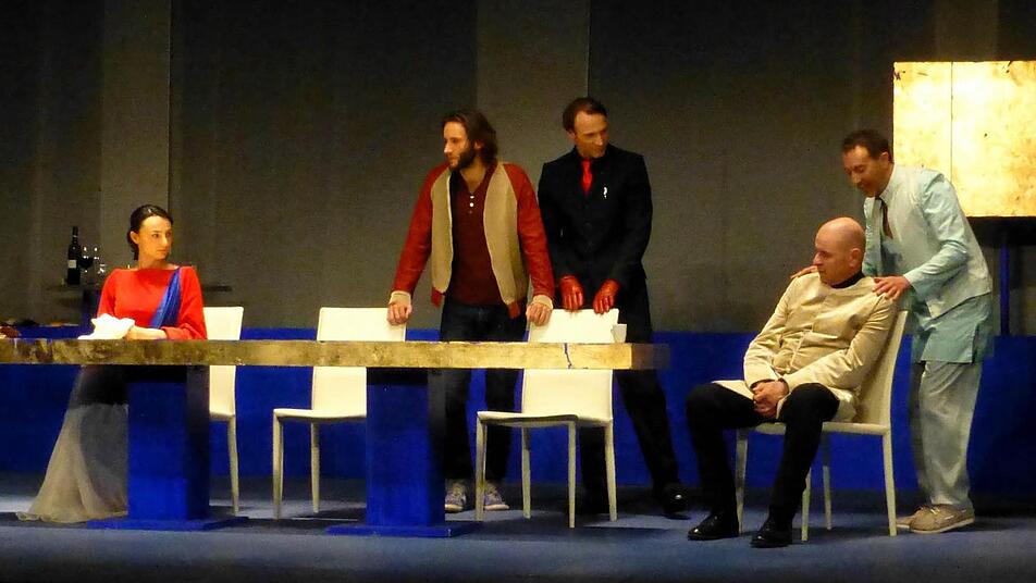 Für die Regie ist ein solches Thesen- und Diskutierstück natürlich ein ganz schön schwieriger Brocken. Nikolaus Büchel bemühte sich redlich und mit Erfolg, die fünf Protagonisten aus anderen Sphären in menschliche Hüllen unserer Zeit zu kleiden. Gottvater als alter, abgeklärter, an der Espressomaschine hängender Konzernchef, der aber mit einer Handbewegung Licht werden lassen kann, wurde von Jörg Reimers als sehr milder, fast desinteressierter, nur in Zornesausbrüchen richtig eindrücklicher Firmenchef im Allesentscheider- und Verantwortungs-Frust gegeben.