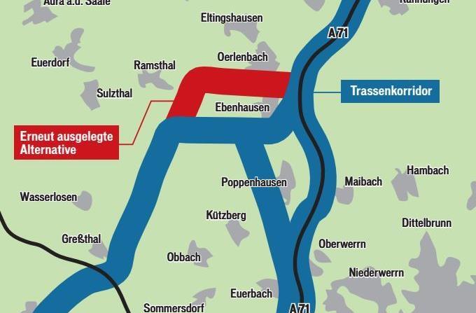 Laut aktuellem Plan teilt sich der die A71 von Norden entlangkommende Trassenkorridor oberhalb von Poppenhausen (Landkreis Schweinfurt). Ein Strang führt geradewegs die Autobahn runter weiter bis Bergrheinfeld. Der andere zweigt westlich ab und knickt südwestlich ab Richtung Arnstein beziehungsweise Großgartach in Bad-Württemberg - und zwar mitten zwischen Oerlenbach und Ebenhausen hindurch. Zuletzt vorgesehen war eine Führung des Korridors südlich von Ebenhausen. Das Verrückte: Diese Trassenführung war schon einmal Thema, galt als verworfen.
