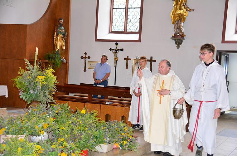 Einen festlichen Gottesdienst mit Kräuterweihe zelebrierte der polnische Priester "Tadek". Vor der Segnung besuchte er die Helfer des Obst- und Gartenbauvereins, die die Kräuterbüschel banden.