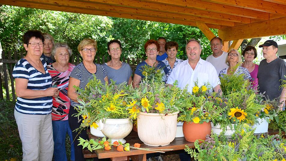 Die Vorbereitung der Kräuterweihe erlebte "Tadek" vor Ort. Er nahm die Einladung von Luise Mahlmeister, der Ehrenvorsitzenden des Obst- und Gartenbauvereins, gerne an und zeigte sich begeistert über das Engagement des Gartenbauvereins beim Binden der vielen Kräuterbüschel beziehungsweise -sträußchen. Die Vereinsmitglieder zeigten sich über den Besuch sehr erfreut, und der Priester war begeistert von den herrlichen Düften der verschiedenen Kräuter. Voller Bewunderung nahm er auch Kenntnis von den herrlich wachsenden Obst- und Gemüsepflanzen, um die sich unter anderem Jochen Schröpfer kümmert.