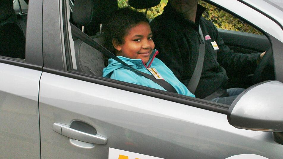 "Mann, das hat mich ganz schön in den Gurt geschmissen", Cheyenne (12) ist froh, wieder aus dem Auto aussteigen zu können. Sie hatte erlebt, mit welcher Wucht sie schon bei einer Vollbremsung mit 30 km/h Geschwindigkeit durch den Gurt abgebremst wird. Die Demonstration war Teil einer Schulstunde der 5. Klasse der Schlossberg-Volksschule Nüdlingen. Der ADAC unterstützt mit der Aktion "Hallo Auto" Schulen mit einem unkonventionellen Verkehrsunterricht.