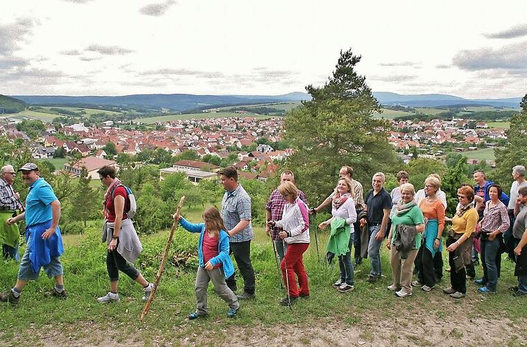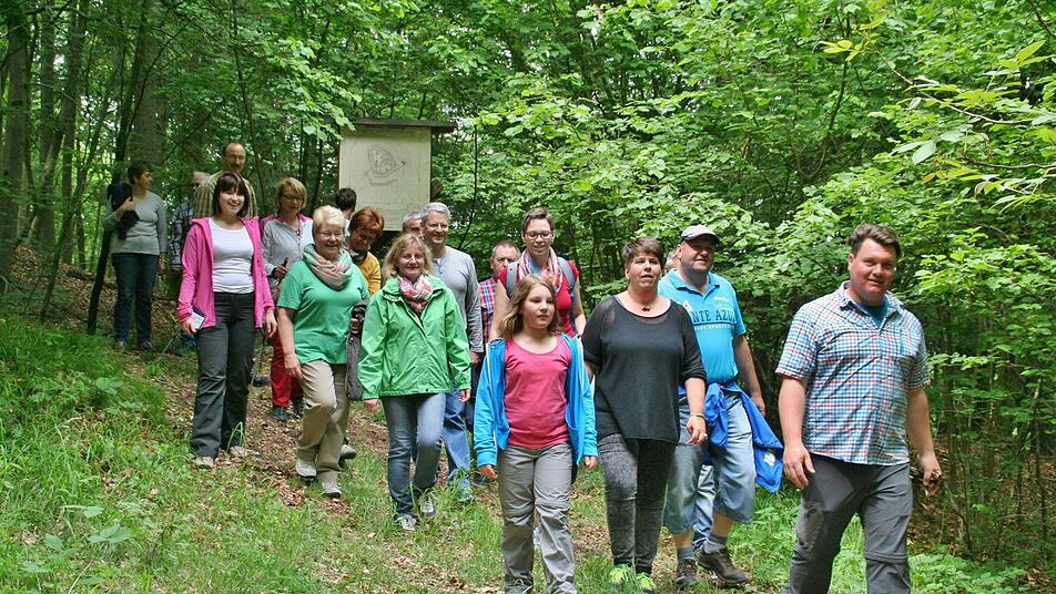 Kundige Begleiter Marcus Lipsius stellte die Besonderheiten der einzelnen Strecken vor und es fanden sich für alle Strecken kundige Begleiter: "Jetzt wollen wir aber losgehen und die Schönheiten in Nüdlingens Feld, Wald und Flur unter die Füße nehmen", gab er den Startschuss und führte seine Gruppe auf dem "Rehbockweg" über den Abenteuerspielplatz zum Vierzehnheiligendenkmal und auf den Lerchenberg zur Hennebergischen Hunburg aus dem 13. Jahrhundert.