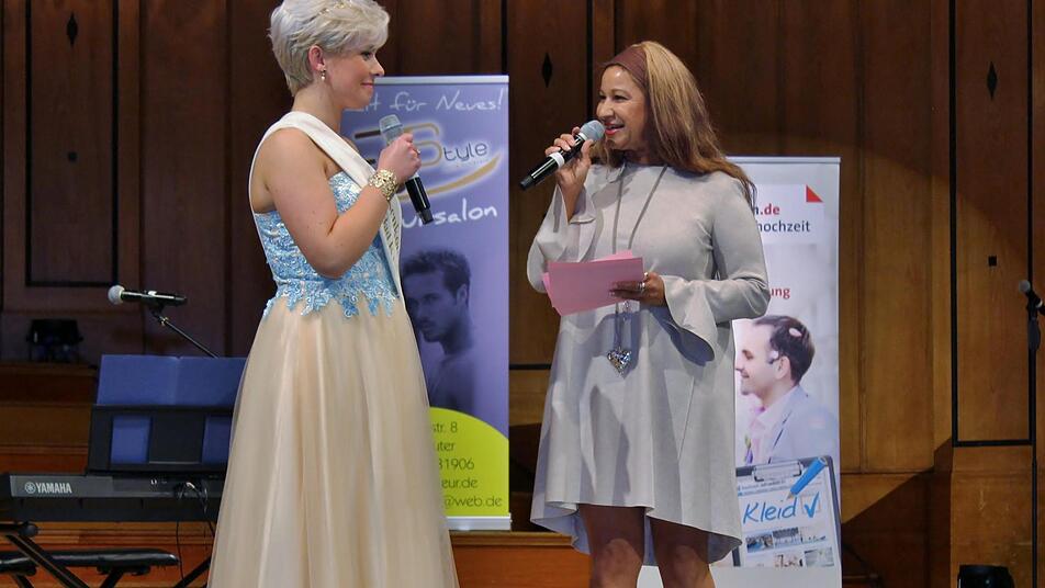 Inzwischen hat Rosenkönigin Nina Dees die Messe eröffnet und Moderatorin Birgit Raichle kündigt eine Bautkleider- und Herrenmodeshow an, die Carmen Rottenberger und Carina Tessari mit viel Musik und abwechslungsreicher Choreographie präsentieren. Viel Beifall gibt es für die Models in Weiß und die Herren nach dem neuesten Trend in Cremebeige und Hellblau.