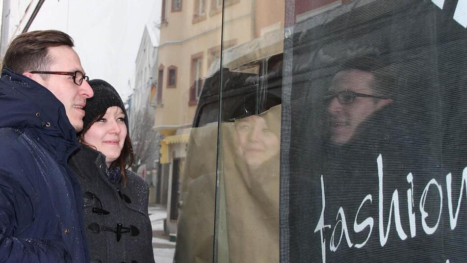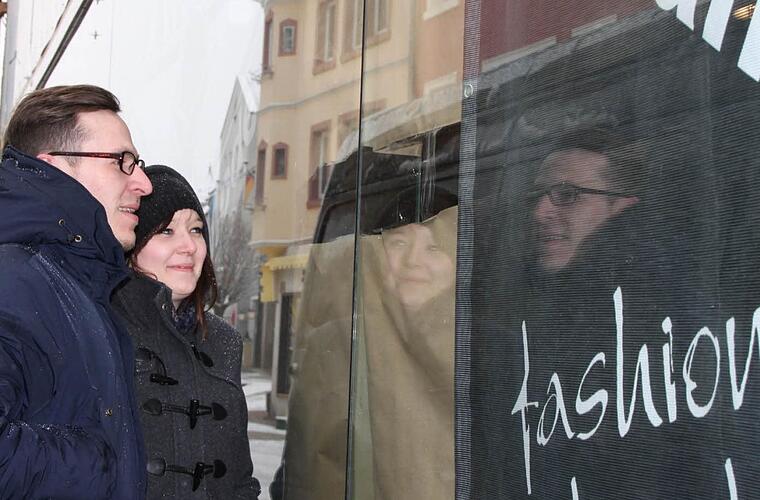 Jenny Striebel und Andreas Waldmann werfen einen Blick durch das Schaufenster der ehemaligen Filiale von NKD. Nur ein kleines Loch ist frei, ansonsten ist alles mit braunem Papier abgeklebt. Die beiden Touristen sind aus Garmisch-Partenkirchen in die Rhön gekommen. Bei einem Stadtspaziergang wollten sie die Kurstadt erkunden - und kamen dabei auch an den leeren Schaufenstern in der Ludwigstraße vorbei.