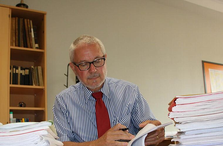 Da stehe unter anderem der Umzug der Schul-Bibliothek an, eine lange Menschenkette soll die Bücher weiterreichen. Zudem liegen etliche Stapel mit Schülerarbeiten auf Kubitzas Tisch. Die so genannte Direktorats-Respizienz, also die Kontrolle aller Schulaufgaben und der wichtigsten "Exen" ist dem Schulleiter sehr wichtig. Mehr als 900 Arbeiten landen so pro Schuljahr auf seinem Tisch.