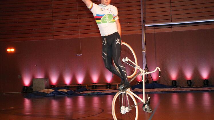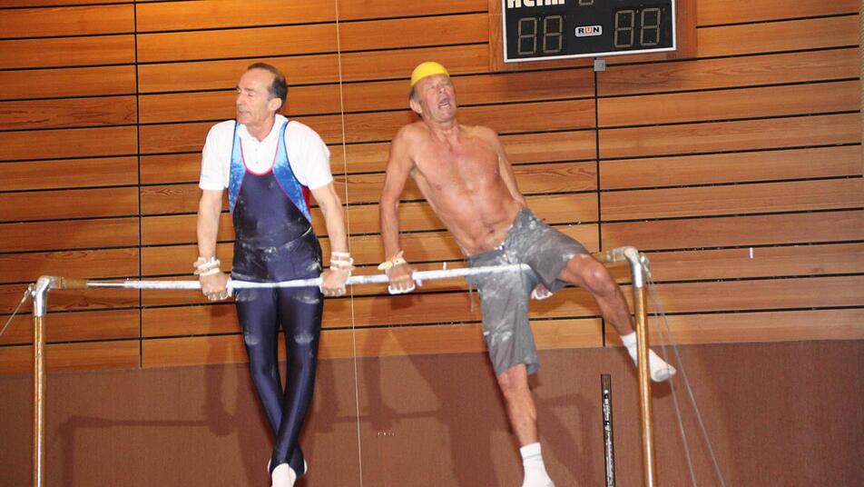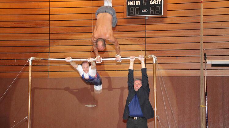 der Schönauer Rhönradfahrer und der ehemalige Reckweltmeister Eberhard Gienger. Gienger konnte sich allerdings nicht mehr an seinen Auftritt vor fast 30 Jahre erinnern, gab er in der Kabine zu. Bei seinem Auftritt staunte das Publikum dann, wie der 61-jährige und sein Turnerkollege und Olympiateilnehmer von 1972, Bernd Effing (64 Jahre), noch immer das Reck beherrschen. Solche aktiven Auftritte wie in Münnerstadt seien aber selten geworden, sagt Gienger.