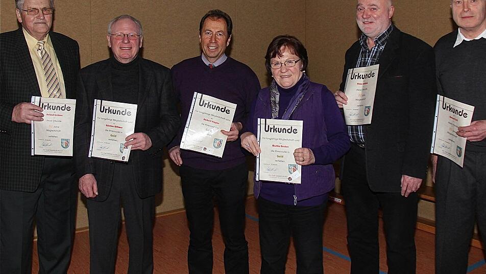 Für 50 Jahre Mitgliedschaft wurden Peter Claßen, Helmut Leidner und Roland Sell geehrt. Gold für ihre 40-jährige Treue bekamen Martha Becker, Günter Dittmar und Norbert Kippes. Für 25 Jahre Mitgliedschaft ging jeweils eine Silbernadel an Ulla Bahmer, Annette Hannawacker, Werner Heid, Wolfgang Krämer, Monika Heinlein-Pfennig, Petra Keller, Heidi Koch, Käthe Schaupp und Ulrike Sikora. Bronze für 15 Jahre bekamen Rita Scholl und Werner Vetter. Seit 60 Jahren gehören Adolf Walz und Erich Christl dem TV/ DJK an.