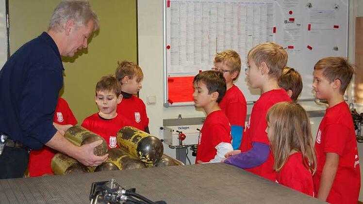 Die Jungs waren voll dabei. Peter Gehring, der Leiter des Atemschutzzentrums weckte das Interesse. Für was sind die Anzüge? Warum sind die Anzüge auch rot? Wie Heiß ist es in den brennenden Räumen? Dieses und vieles mehr wollten die jungen Burschen wissen. Als Peter Gehring fragte was die Feuerwehrmänner wohl früher gemacht, als es keine Atemschutzgeräte gab kam prompt die Antwort: "Dann sinse gleich wieder raus".