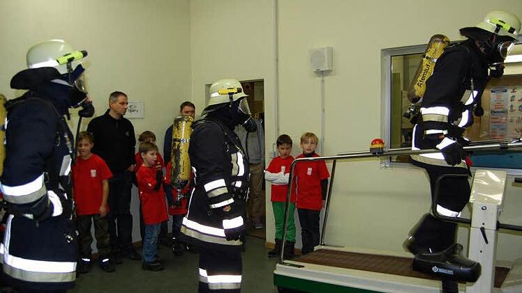 Heute löschen und retten die ausgebildeten Feuerwehrleute auch bei extremen Temperaturen. So können in den brennenden Räumen bis zu 1500 Grad entstehen, wobei bei 150 Grad bereits gefährliche Dämpfe entstehen, so Gehring. Wissbegierig waren die Kinder auch im Prüfraum des Zentrums, wo immer wieder die Atemschutzausrüstung geprüft und die Flaschen neu gefüllt werden.