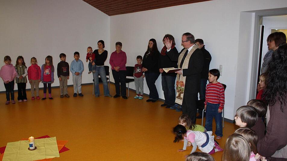 Noch steht der Bauzaun, noch ist Umfeld etwas wüst. Aber am Wochenende war der Umzug, am Dienstagmorgen feierte Dekan Thomas Keßler mit Kindern und Betreuerinnen aus diesem Anlass eine kleine Andacht. Er dankte "als Pfarrer" besonders dem Team, das in der Übergangszeit durchgehalten hat.