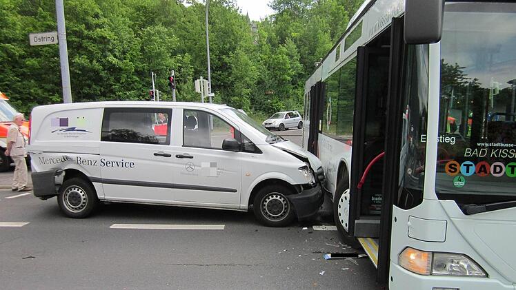 Der Unfallverursacher war nach Angaben der Polizei zu schnell unterwegs. Er fuhr auf dem Bad Kissinger Ostring und konnte an der Ampelkreuzung Reiterswiesen-Bahnhof nicht mehr rechtzeitig bremsen. Mit seinem Auto prallte er auf einen Transporter, der bei Rot gestoppt hatte. Diesen schob er auf einen Linienbus, der die Kreuzung von der Kissinger Straße in Richtung Bergmannstraße überqueren wollte. Drei Insassen des Busses wurden leicht verletzt. Ebenso wie der Fahrer des Unfallfahrzeugs und des Transporters. Die fünf Leichtverletzten wurden ins Krankenhaus gebracht.