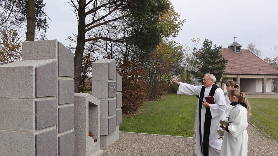 Im Rahmen der Friedhofsandacht zu Allerheiligen erhielt die von der Stadt Bad Kissingen neu errichtete Urnenwand und der Urnenhain durch Pfarrer Edwin Ziegler den kirchlichen Segen. In der Urnenwand mit "Himmelsleiter" können in 14 Kammern bis zu 42 Urnen beigesetzt werden.
