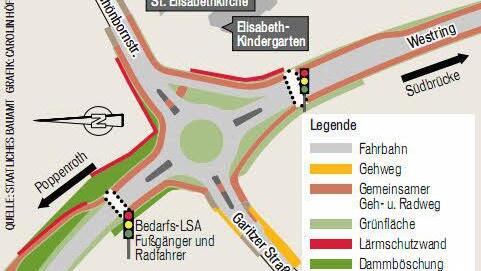 Darin enthalten sind nicht nur der Kreisverkehr selbst, sondern auch die vier Äste: Das Baufeld reicht bis 221 Meter in Richtung Südbrücke, bis 109 Meter in Richtung Oberthulba, 103 Meter in die Schönbornstraße und 76 Meter nach Garitz hinein. Enthalten ist in diesen Kosten auch eine Lösung für den Radweg: Neben die bestehende Brücke über die Straße "Steinmauer" kommt eine weitere: 18 Meter lang, 3,50 Meter breit und 180 000 Euro teuer