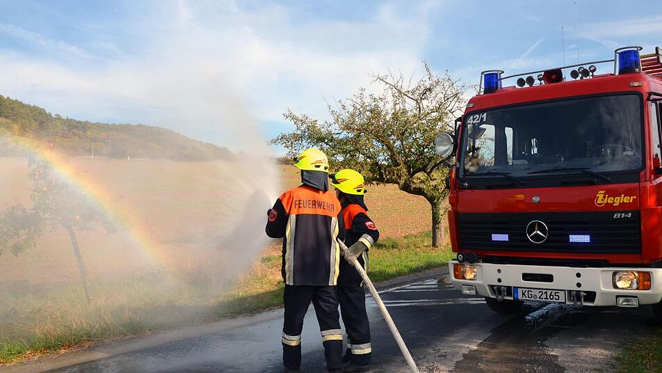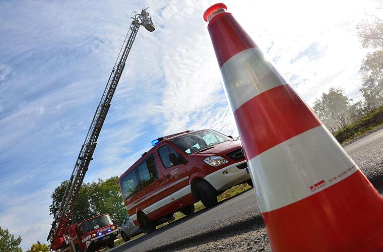 Tanklöschfahrzeuge sollten zusätzlich als mobile Reserve dienen und die aufgestellten Puffer/Faltbehälter immer wieder neu befüllen. Dass dies Nüdlingen nicht allein schafft, war von vornherein klar, und selbst mit der zweiten Wehr aus Haard hätte das Schlauchmaterial nicht gereicht, schließlich waren doch über ein Kilometer B-Schläuche zu verlegen, um die geplanten 3000 Liter Löschwasser pro Minute zu erreichen. Also wurden über die Rettungsleitstelle kurzerhand am Samstagnachmittag, bei herrlichem Herbstwetter neben den beiden Ortswehren noch die von Münnerstadt, Winkels, Bad Kissingen, Hausen und Kleinbrach alarmiert. Rund 20 Fahrzeuge, darunter mehrere Tanklöscher und die beiden Drehleitern aus Bad Kissingen und Münnerstadt fuhren auf, und das ein oder andere Mal wurde es ganz schön eng in der Haardstraße, wenn sich die dicken roten Brummis aneinander vorbeischoben. Aber auch das gehört mit zur Übung, die Bürgermeister Harald Hofmann, von Anfang an mitbeobachtete: "Aussiedlerhöfe, wie diesen hier, haben wir einige rund um Nüdlingen", so Kommandant Alexander Frey, der sich nach Abschluss der fast zweistündigen Übung sehr zufrieden mit den Leistungen der über hundert eingesetzten Wehrmänner und Frauen zeigte.