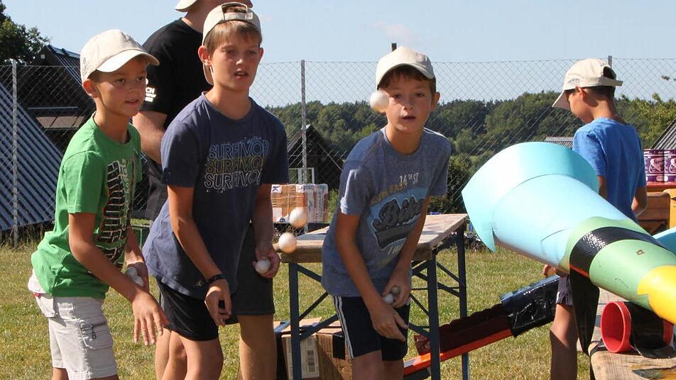 Derweil bekommen die Kinder gar nicht genug vom Toben. "Ich finde die Hütten sehr schön", sagt etwa Finn aus Hammelburg. "Sie sind so groß und die Spiele sind lustig." Dann nimmt er einen Tennisball und zielt genau auf eine Röhre aus Bastelkarton, die die Kinder eigens für das Spiel gebastelt haben. "Das trainiert die Koordination der Finger", erklärt Patrick Haas vom Betreuer-Team ernsthaft. Dann grinst er. "Aber hauptsächlich soll es Spaß machen!"