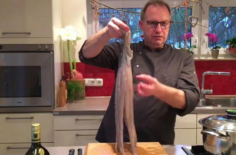 Kraken gehören zu den Meerestieren, die keinen Qualitätsverlust erleiden, wenn sie vor dem Kochen schon einmal tiefgefroren waren. Ganz im Gegenteil, erklärt Markus Bötz auf seinem Youtube-Video. Der Münnerstädter Fachoberlehrer für die Köche-Ausbildung an der Bad Kissinger Berufsschule ist seit zwei Monaten mit einem eigenen Kanal auf Youtube vertreten. Seit der Lockdown begonnen hat und auch kein Präsenzunterricht an der Berufsschule möglich ist, unterrichtet er die angehenden Köche in der Fachpraxis auf diesen Weg.