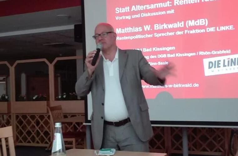 Für einen Kurswechsel in der Rentenpolitik hat der rentenpolitischer Sprecher der Bundestagsfraktion Die Linke, MdB Matthias B. Birkwald bei einer Veranstaltung plädiert, den der Verdi Ortsverein Sinn-Saale und der DGB Kreisverband Bad Kissingen im Burkardus-Wohnpark in Bad Kissingen organisiert haben. Das Motto des Abends lautete: "Rente muss für ein gutes Leben reichen."