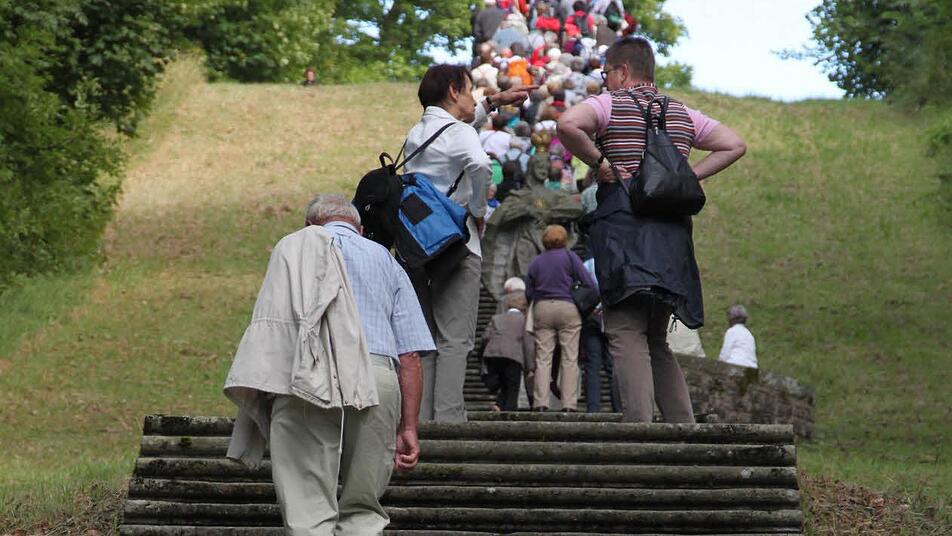 Der Weg die 254 Stufen hinauf ist beschwerlich. Brigitta Bohlig aus Bad Kissingen kann ihn seit zwei Jahren nicht mehr laufen. Die 81-Jährige ist mit dem Bus direkt zur Kirche gefahren. Insgesamt sind 36 Mitglieder der Pfarrgemeinde Herz Jesu zur Wallfahrt gekommen. Seit 15 Jahren ist Bohlig schon dabei.
