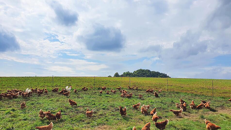 Mario und Diana Hümpfer haben rund 550 Hühner auf ihrem Naturland-Hof in Großenbrach. Hümpfer beschreibt ein glückliches Huhn so: "Es ist aktiv, nicht apathisch, ist neugierig, nutzt den Auslauf und ist nicht verängstigt." Letzteres sei manchmal der Fall, wenn es im Winter zu vermehrten Habichtangriffen kommt. Das merken die Tiere.