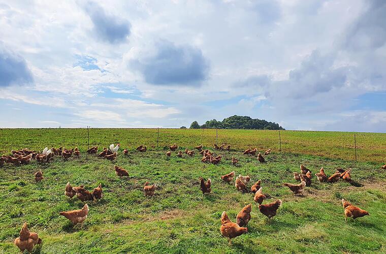 Der Vorteil im Landkreis: In dieser ländlichen Region gibt es einige kleine Bauernhöfe mit Hühnern, die draußen erkunden, picken und scharren können. Dass sie das auch tun, ist schon das erste Anzeichen für deren Zufriedenheit, sagt Frank Vogler vom Familienbetrieb Voglers in Neuwirtshaus.