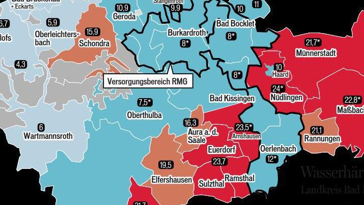 Grenzen mitten durch die Stadt Einer der größten Wasserversorger im Landkreis ist die Rhön-Maintal-Gruppe (RMG) mit Sitz in Poppenhausen. Das Wasser für den Landkreis Bad Kissingen bezieht der Zweckverband vom Fuße des Kreuzbergs, deshalb ist es mit durchschnittlich 8 Grad deutscher Härte (dH) relativ weich. Die weiche Zone reicht bis nach Rottershausen, der Rest der Gemeinde Oerlenbach hat dann im Mittel 12 Grad dH.