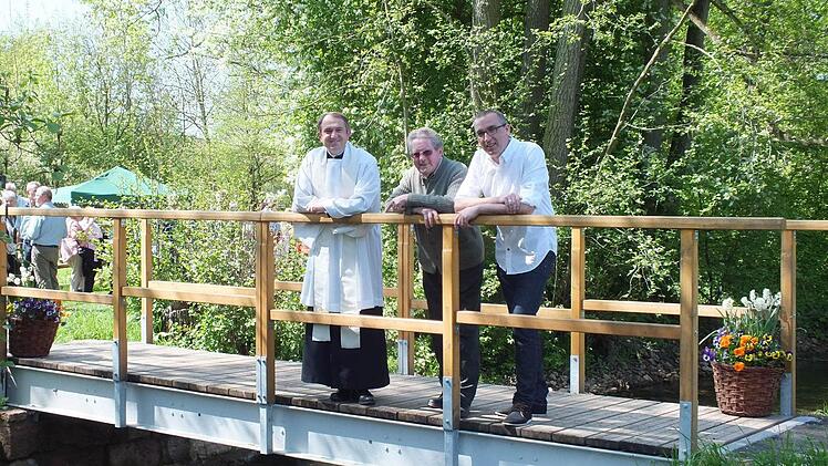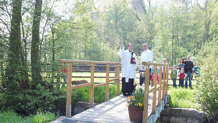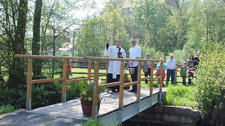 Es ist die siebte Brücke über die Aschach, die jetzt den kirchlichen Segen erhielt - zur Freude von Initiator Leo Bauer.