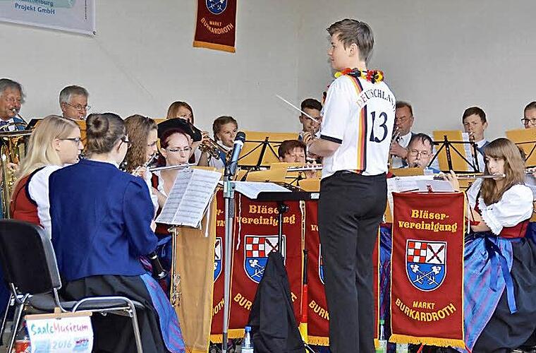 Eigentlich ist sie die Nummer 1. Doch am Samstagabend ließ es sich Dirigentin Manuela Möller nicht nehmen, als Nummer 13 zu agieren. Sie hatte ein Deutschlandtrikot mit der Nummer von Thomas Müller unter ihrem Blazer versteckt, den sie zum Ende des kleinen Konzertes auszog. Mit der Aktion überraschte sie nicht nur ihre Musiker von der Bläservereinigung Burkardroth, sondern auch das Publikum. Das hatte sich wieder zahlreich am Musikpavillon eingefunden und durfte am Samstagabend beim "Blasmusik-Open-Air" etliche angenehme Überraschungen erleben.