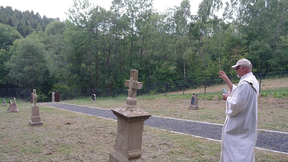 Für diese Kriegsvorbereitungen mussten die Einwohner "gewaltsam ihre Heimat verlassen", so Isabelle Geck in ihrer Ansprache auf dem Werberger Friedhof. Doch werde Werberg einmal im Jahr wieder zu "einem blühenden Ort". Diakon Donald Löw segnete Gräber und Kreuze auf der Gedenkstätte erneut. Bei seinem ersten Besuch der Friedhöfe auf dem Truppenübungsplatz sei ihm bewusst geworden: "Hier ist etwas, das bleiben muss, sonst ist unsere Zukunft verbaut".