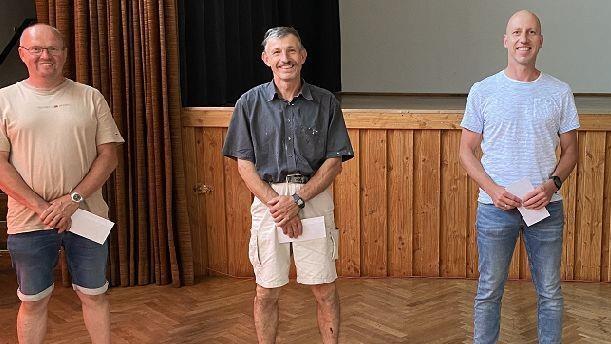 Für 25-jährige Betriebszugehörigkeit und den damit verbundenen kompetenten Einsatz wurden geehrt: Michael Raab (Staatlich geprüfter Bautechniker/Prokurist), Thomas Wehner (Dachdecker) und Sascha Eckert (Zimmermann).