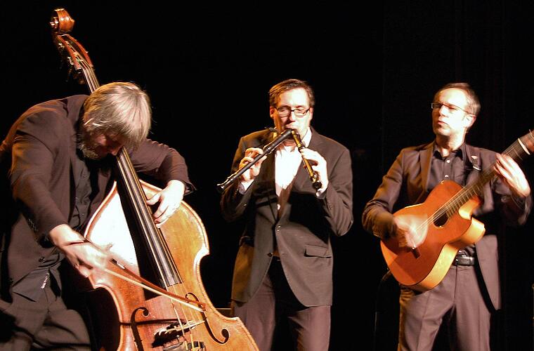 Schon mit dem munteren "Moretti Swing" zum Auftakt, eine Hommage an frühere Zeiten als Straßenmusikanten in Italien, und der "Pathetique" von Ludwig van Beethoven in ihrer eigenen "Interpretation für drei einfache Holzinstrumente" zeigten Tobias Reisige (Flöten), Markus Conrads (Bass) und Anto Karaula (Gitarre) mit sichtbarem "Spaß an der Freud'", dass sich gute Kompositionen nicht in Schubladen wie E- oder U-Musik packen lassen.