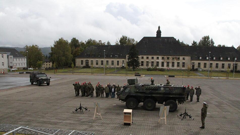 Zum Schluss drehte Gordon Stütz im Panzer einer Ehrenrunde auf dem Platz. Anschließend trafen sich die Gäste zum Empfang. Traditionsgemäß überreichte der Wildfleckener Bürgermeister Gerd Kleinhenz (PWW) dem scheidenden Kommandanten "Die letzte Kuh Wildfleckens" - eine Fotografie, die das Ende der Landwirtschaft in der Rhöngemeinde dokumentiert. Mit Stütz habe er "stets auf Augenhöhe kommunizieren" können, sagte Kleinhenz und wünschte dem neuen Kommandanten einen guten Start.
