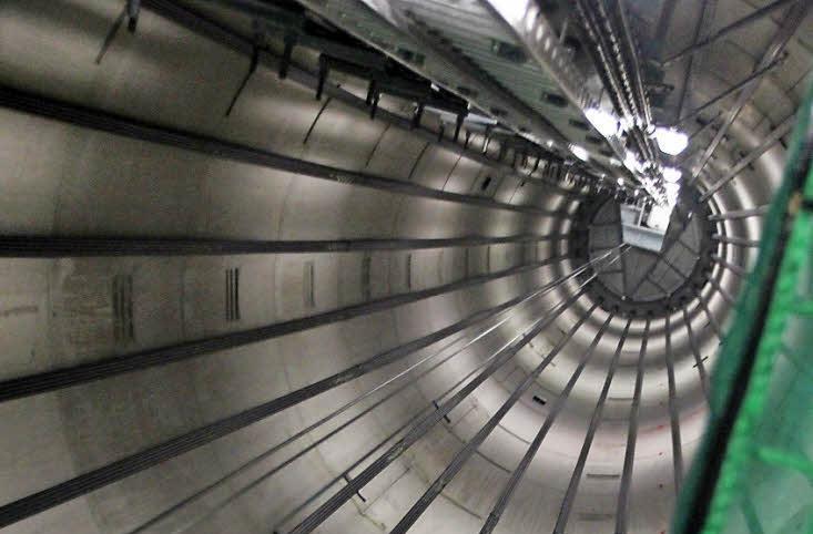 Für die erfahrenen Monteure ist das aber auch eine Arbeit, die sie problemlos bewältigen. Ihren Arbeitsplatz in schwindelnder Höhe erreichen sie über einen engen Fahrstuhl im Innern des Turmes. Der bringt sie zum Maschinenhaus, an das die Flügel dann angeschlossen wurden.
