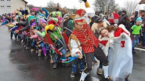 größtenteils sehr phantasievoll kostümiert waren. Statt der sonst etwa acht Festwagen und fünf Fußgruppen mögen diesmal zwei oder drei Gruppen aus den Nachbardörfern gefehlt haben, doch fiel diese wetterbedingte Verkürzung des Festzuges kaum auf, da vor allem die Insassen der mobilen Achterbahn mit ihren akrobatischen Links- und Rechtskurven bei den Schaulustigen umso mehr für Unterhaltung sorgten.