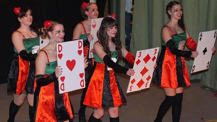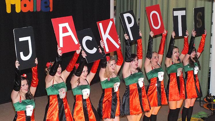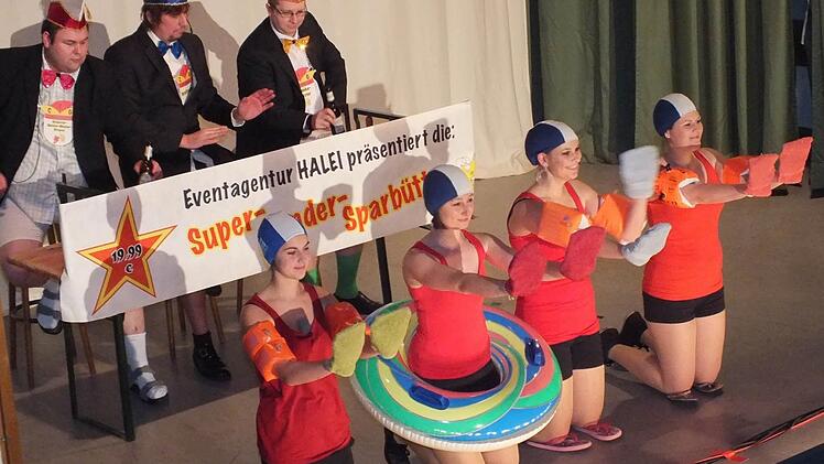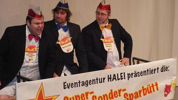 Dass ein Büttenabend nicht mehr als 19,95 Euro kosten muss, das zeigte die Eventagentur Hallei, die mit ihrem auf drei Mann reduzierten Elferrat für Stimmung sorgte. Trotz des geringen Budgets gab es Bütten-auftritte und Gardetänze. Auf ein "Dinner for one" ganz im Aschacher Stil waren die Zuhörer dann eingeladen. Theresa Bocklet spielte die "alte Dame" und wurde von Florian Keller als "Butler Lubber" bedient. Dabei nahm man Lokalgrößen aufs Korn: "Der gleiche Zinnober wie letztes Jahr."