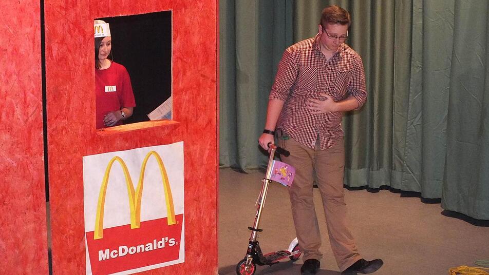 Wie es für einen jungen Mann ist, der sich im Außendienst befindet und nicht mehr von Mutters Kochkünsten umsorgt wird, davon wusste Moritz Kaiser zu berichten. Ein Hingucker war seine pantomimische Darbietung, wie er in seinem Auto das Mahl von McDonald's verzehrt.